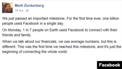ინფორმაცია საკუთარი ორგანიზაციის მორიგი წარმატების შესახებ ფეისბუქის შემქმნელმა და ხელმძღვანელმა მარკ ცუკერბერგმა ოფიციალურ ვებგვერდზე გამოაქვეყნა (https://www.facebook.com/zuck). განცხადებაში ნათქვამია, რომ „ორშაბათს, დედამიწაზე მცხოვრები ყოველი შვიდი ადამიანიდან, ერთი ფეისბუქზე იმყოფებოდა“. ცუკერბერგის თქმით, ეს უდიდესი მონაპოვარია, თუმცა კონტაქტების მთელ მსოფლიოში დამყარების საქმეში ეს „ჯერ მხოლოდ დასაწყისია“. მარკ ცუკერბერგის, 2004 წელს ჯერ კიდევ ჰარვარდის უნივერსიტეტის სტუდენტის მიერ დაარსებულ ქსელს, დღეს მილიარდნახევარზე მეტი მომხმარებელი ჰყავს.