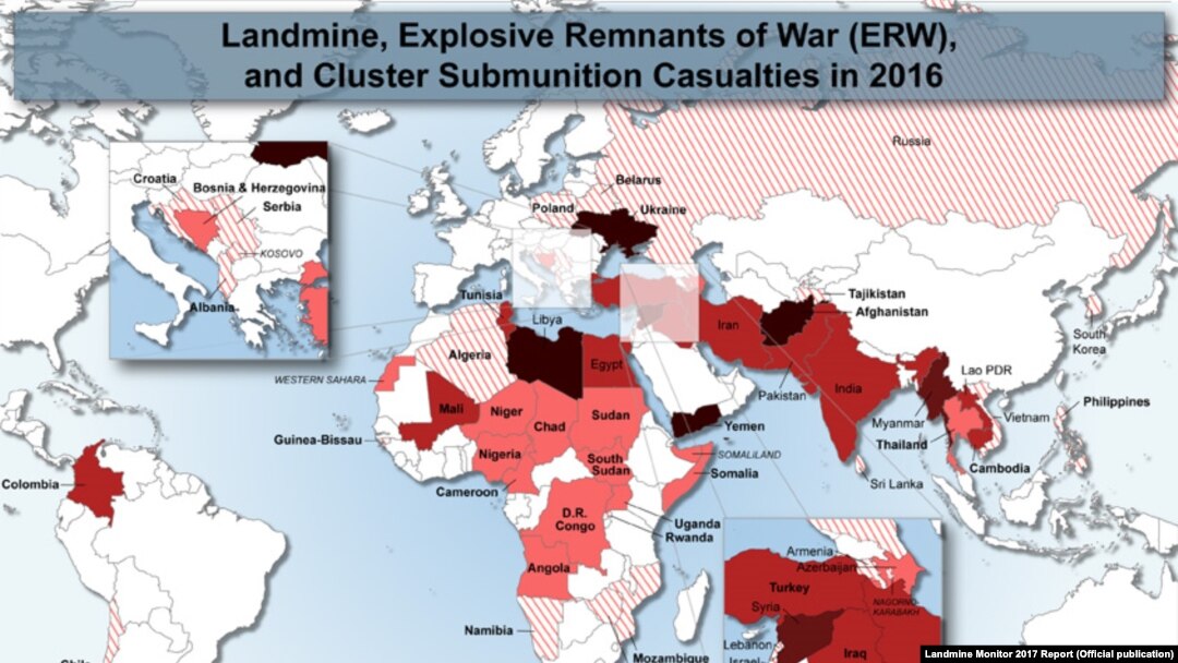 საერთაშორისო სადამკვირვებლო ჯგუფი აცხადებს, რომ მხოლოდ 2016 წელს, სხვადასხვა ქვეყნის ტერიტორიაზე ნაღმებმა დაახლეობით, 2 100 ადამიანის სიცოცხლე იმსხვერპლა.