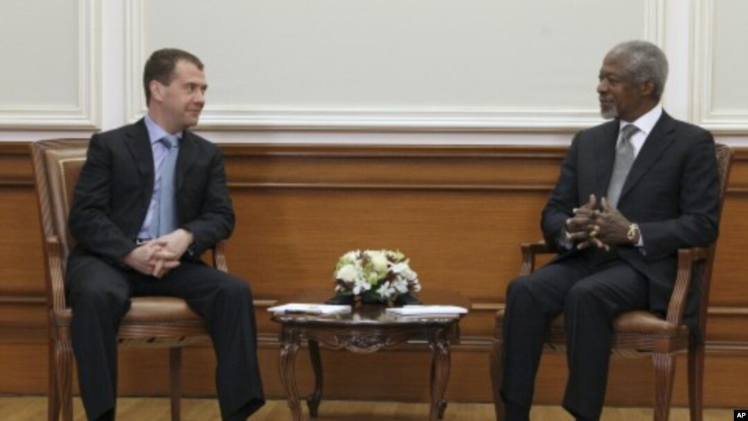 ანანი: „ჩვენ ვაგრძელებთ ამ საკითხზე მუშაობას და მე მოსკოვის მხარდაჭერისა და რჩევის იმედი მექნება.“ „თქვენ ნამდვილად მართალი ხართ“-, განუცხადა ანანმა მედვედევს, -„როცა ამბობთ, რომ დამასკოს ნამდვილი შესაძლებლობა აქვს ჩემთან ითათბიროს და მედიაციის პროცესით ეს კონფლიქტი დაასრულოს, სირიაში შეუშვას ჰუმანიტარული ტვირთი და დაიწყოს პოლიტიკური პროცესი, რომელიც უთანხმოებას მშვიდობიანი გზით დაარეგულირებს.“